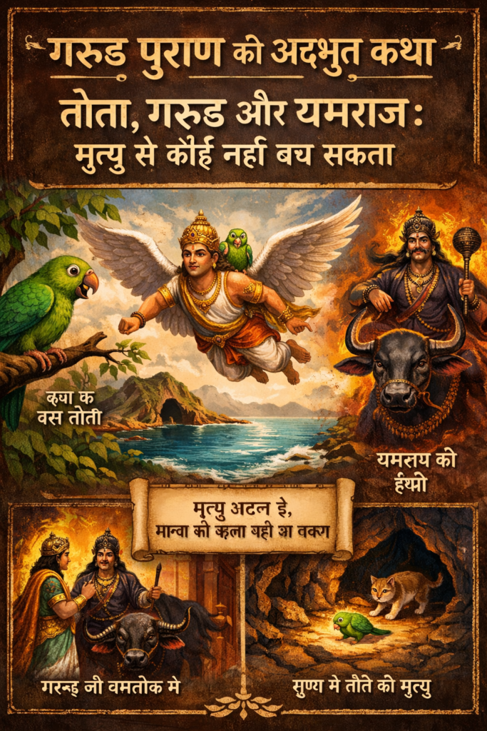 इसी ग्रंथ में एक अत्यंत प्रसिद्ध कथा आती है – तोते, गरुड़ जी और यमराज की। यह कथा हमें सिखाती है कि चाहे हमारी पहुंच कितनी भी ऊंची क्यों न हो, मृत्यु से बचना संभव नहीं।
