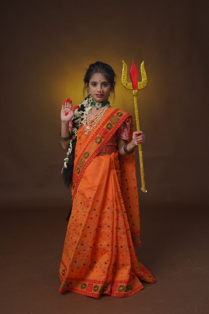 - इन दसों हाथों में त्रिशूल, गदा, तलवार, कमल, धनुष-बाण, कमंडलु, माला, कमंडल, घंटा और वरमुद्रा धारण है।